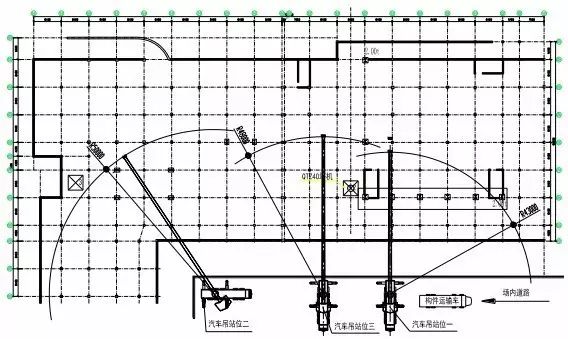 (2)汽車吊站位二:適用于 4-4軸 9-4軸區(qū)域各層鋼構(gòu)件的轉(zhuǎn)運(yùn)和吊裝。