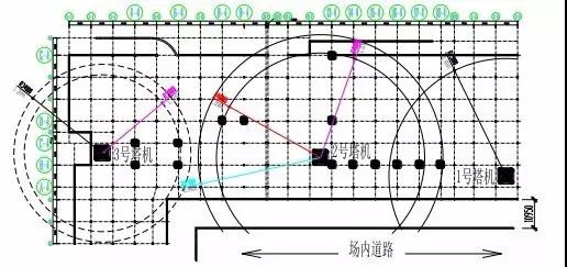 (1)本工程主體結(jié)構(gòu)的東、西兩側(cè)距作業(yè)點(diǎn)較遠(yuǎn),北側(cè)為場(chǎng)外道路并有一路高壓供電線路因此該三方向在施工中均無(wú)法使用。