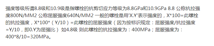 螺栓性能等級(jí)的含義是通用的標(biāo)準(zhǔn),相同性能等級(jí)的螺栓,不管其材料和產(chǎn)地的區(qū)別,其性能是相同的,設(shè)計(jì)上只選用性能等級(jí)即可。